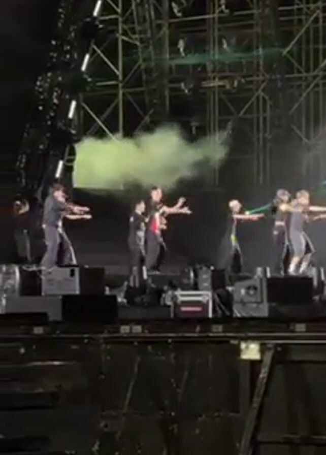 A hip-hop group of nine men performs on an outdoor stage at night. The stage is dark and is partially constructed from scaffolding. The men are wearing mostly dark clothing and sneakers. Their movements are very energetic, and there is light green laser and smoke effects being used.