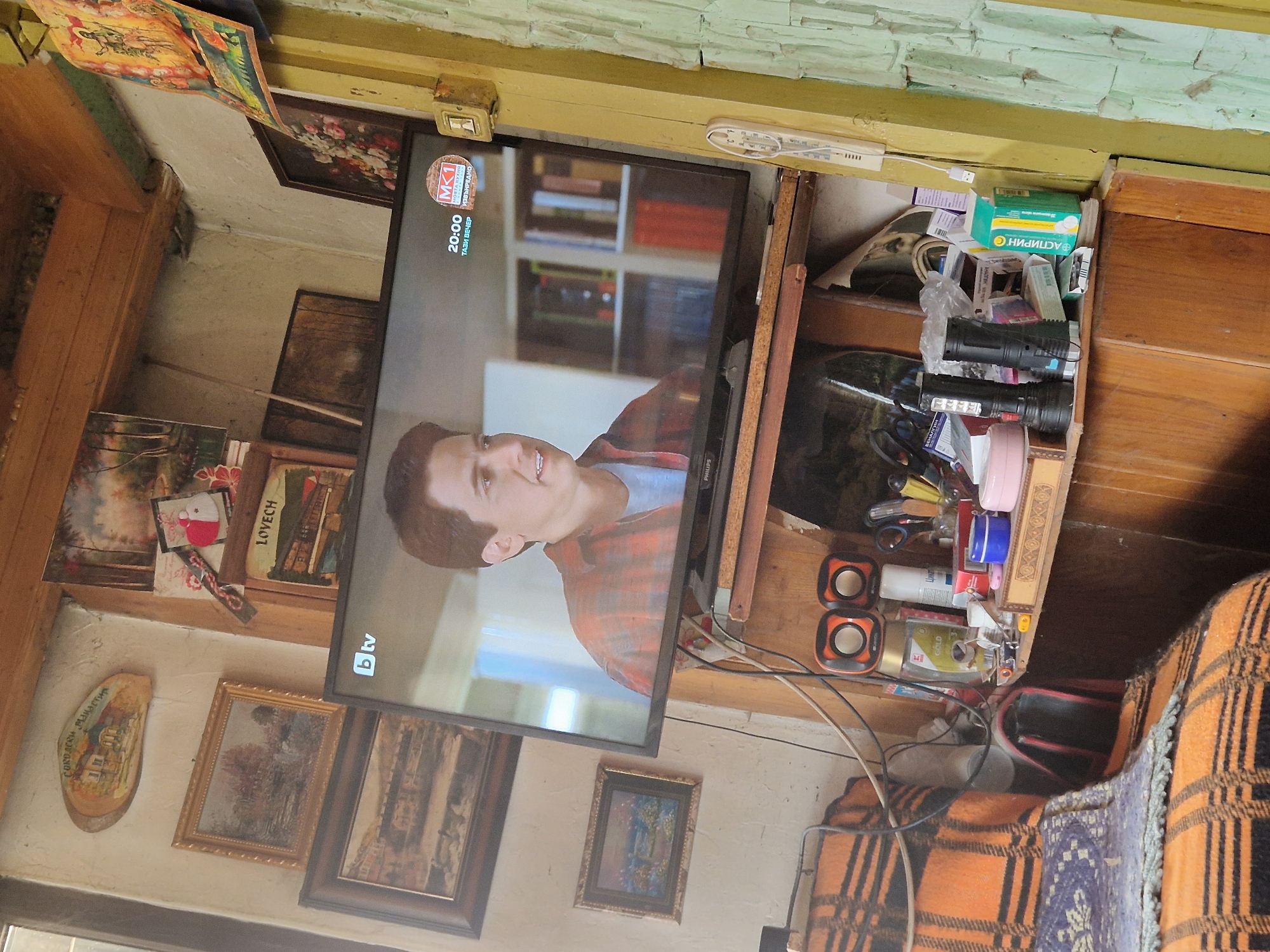 n interior scene with a television in focus, displaying a man in a plaid shirt. The TV is surrounded by miscellaneous objects and pictures on the wall. The environment appears cluttered, with shelves filled with items like medicine boxes, flashlights, and speakers. The lighting suggests an indoor environment, and part of a plaid couch is visible in the bottom right corner. The city of Raduvene, Bulgaria, is not discernible in the image.