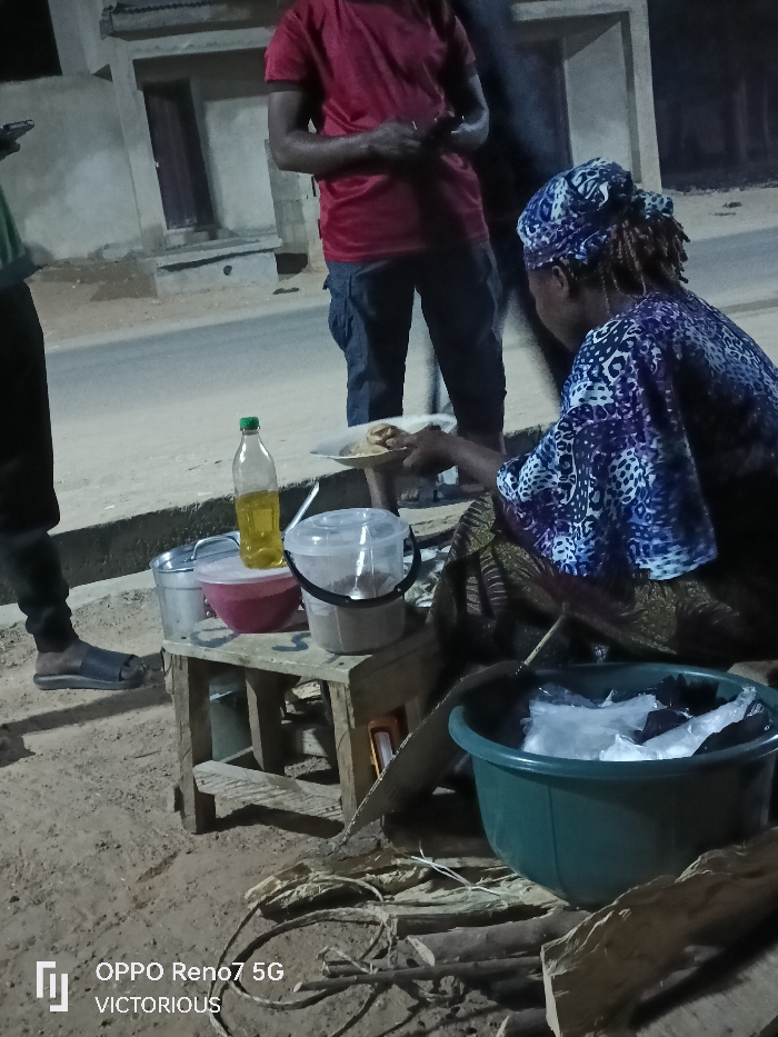 A woman with a headscarf and patterned top sits beside a green bucket, likely containing water and trash bags, on the ground amidst firewood. She hands a plate of food to a man in a red shirt. A small wooden table holds a bottle of oil, bowls, and containers. Another man stands nearby. The scene appears to be an informal food vending setup at night, possibly on the side of a road near a building.