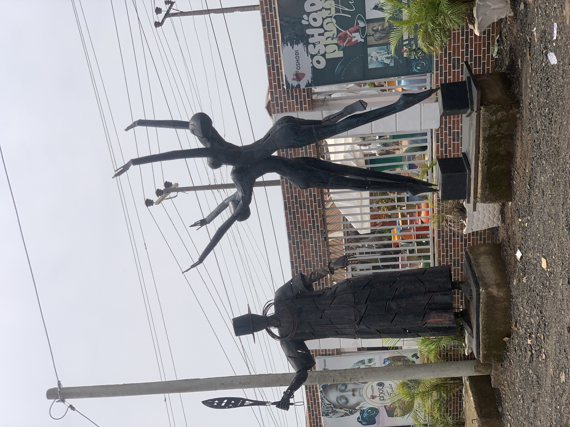two dark metal sculptures in Ikorodu, Nigeria. The first sculpture depicts two abstract figures with outstretched arms, appearing to be in motion or flight. The second sculpture is of a male figure wearing a top hat and holding an object resembling a stylized oar or musical instrument. The sculptures stand on concrete bases next to a building with brick accents. A sign with the word "OSHODI" is partially visible on the building's facade. Utility poles and wires are prominent in the background, and the sky is overcast. The sculptures are situated on a paved area, possibly a street or sidewalk.