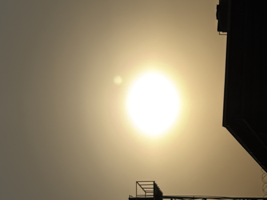 A hazy sun blazes in a pale sky, partially obscured by atmospheric conditions. Dark, silhouetted structures, including a building edge and metal framework, are positioned in the foreground, adding a stark contrast to the bright, diffused light source. The overall image has a muted, almost sepia-toned aesthetic.