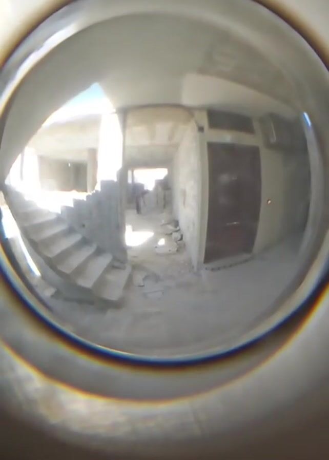 The interior of an unfinished building is viewed through a fisheye lens. There are concrete stairs and a closed door visible. Debris is scattered on the floor. Natural light enters from an opening at the far end of the room. A person is visible in the distance, but obscured by the bright light.