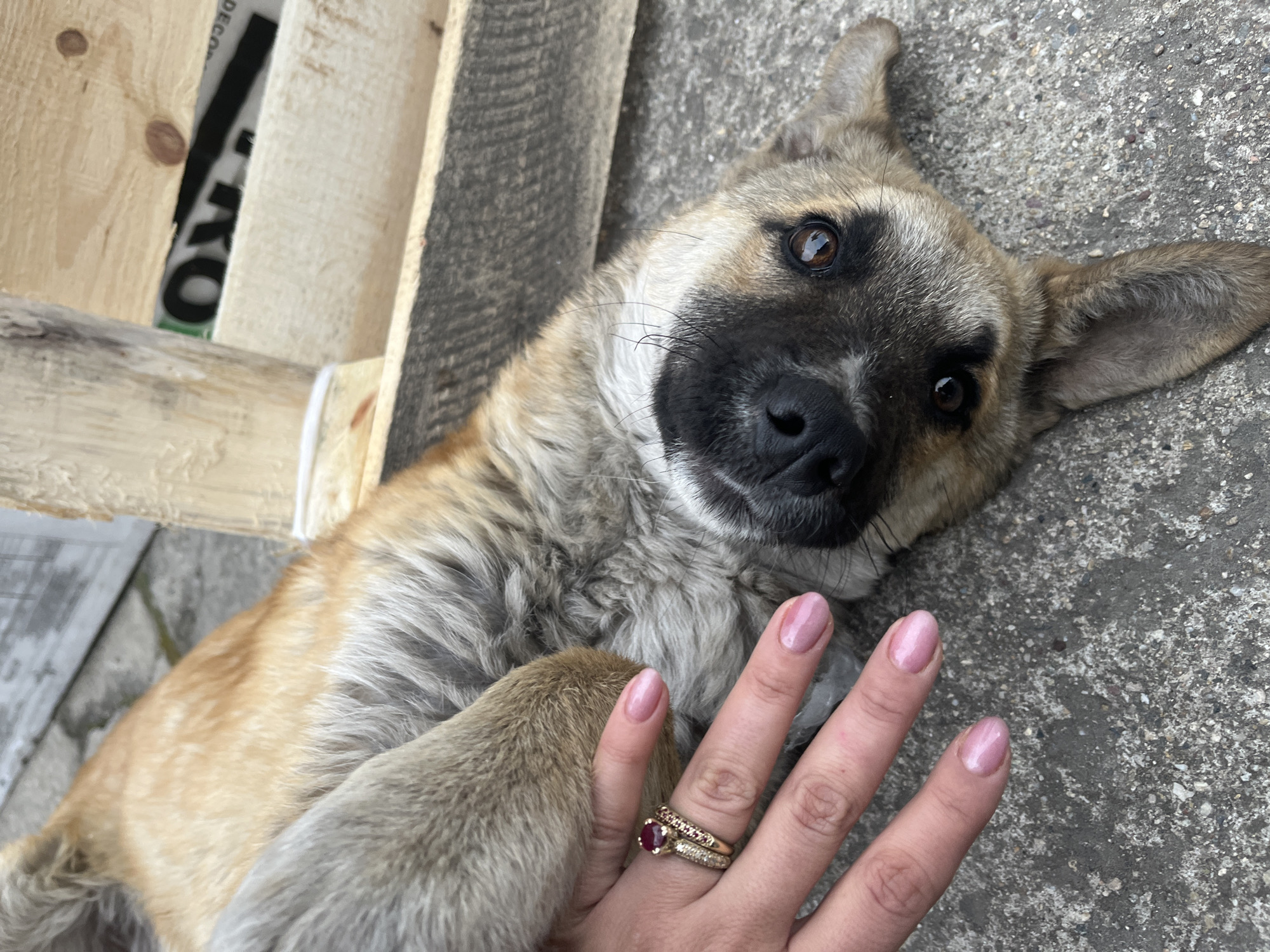A tan and black puppy is lying on its back on a concrete surface with a wooden pallet behind it. A human hand rests on the puppy's paw. The hand has light pink nail polish and is wearing a gold ring with a ruby. The location is unknown.