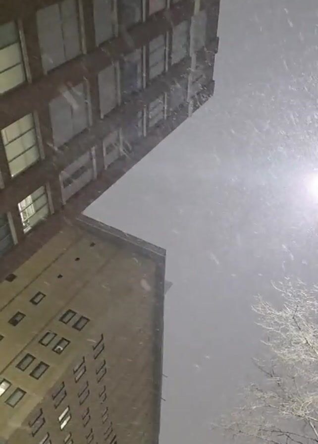 The camera looks up at two tall buildings during a snowstorm. Snowflakes fall heavily against a grey sky, obscuring the view. The buildings are brick and have many windows. A streetlight shines dimly in the background, and a bare tree branch is visible to the right.