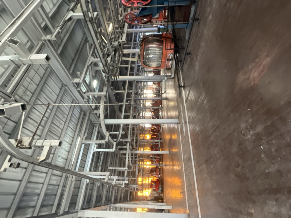 The image depicts the interior of a gondola lift station located in Samokov, Bulgaria. The scene is a large, industrial-style building characterized by a high, corrugated metal ceiling supported by an extensive network of exposed grey steel beams and structural elements. Numerous grey metal support pillars are uniformly distributed throughout the expansive, open floor space, which consists of polished or wet brown wooden planks, marked with two parallel white lines in the foreground. Stationary gondola cabins, predominantly orange and red in color with reflective windows, are arranged in rows under overhead metal tracks that traverse the entire facility. In the mid-ground, to the right, a prominent orange gondola cabin is positioned alongside a blue and red mechanical apparatus featuring large red wheels, indicative of a drive or tensioning system. Further into the background, numerous additional gondola cabins are visible, extending towards a brightly lit area on the far left, where warm light emanates, possibly from windows or powerful artificial sources, casting strong reflections on the floor. A single, indistinct human figure is faintly visible in the far left background near the brightly lit section. The overall environment suggests a storage or loading area for a cable car or gondola system.