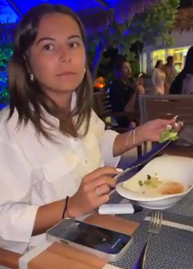 A woman wearing a white collared shirt is sitting at an outdoor restaurant table. She holds a knife in her right hand and a fork in her left, with a small amount of salad on the fork. Her plate is mostly empty. A phone lies face-up on the table beside her plate. The table is covered with a blue-and-white placemat. Other people are seated at tables behind her. The lighting is dark, with a blue light illuminating the scene. The woman looks at the camera and smiles slightly.