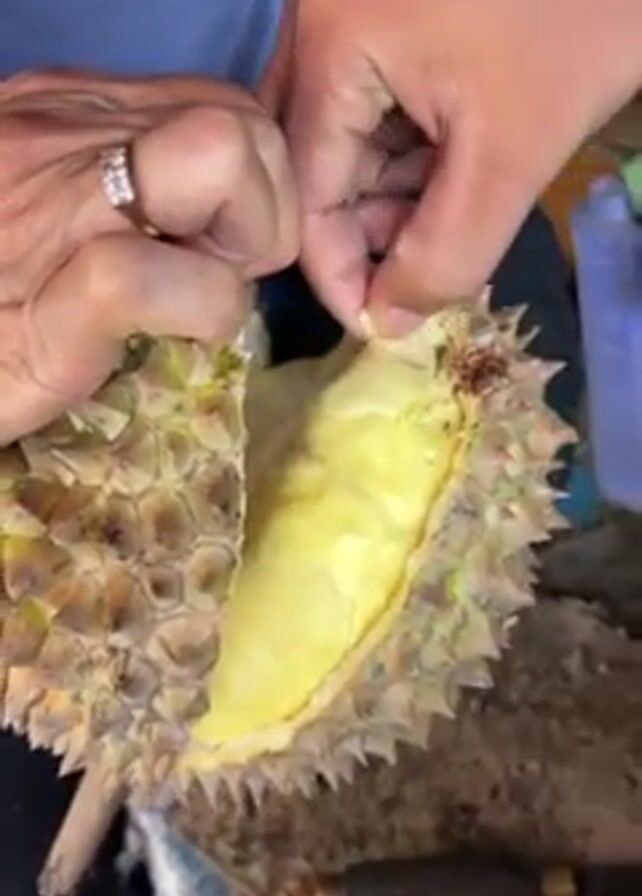 A woman is opening a durian fruit at an outdoor fruit stand. She is wearing a blue long-sleeved shirt and a ring on her left hand. The durian is large and spiky with a section already opened, revealing the yellow fruit inside. She uses her fingers to peel back more of the fruit. In the background, another woman wearing a black and pink shirt and a baseball cap is seated. The scene appears to be a marketplace setting, with other durians and various items visible on the table and in the background. There's also a sign with text in an Asian language behind the woman with the durian.