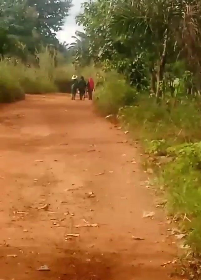 The video depicts a dirt road winding through a forested area. The road is reddish-brown in color. Along the road are trees and vegetation, mostly green. In the distance, three figures, presumably people, are walking away from the camera. One person is wearing a red shirt, another a light-colored hat. The sky is overcast. The camera moves, sometimes focusing on the trees and foliage on the side of the road.