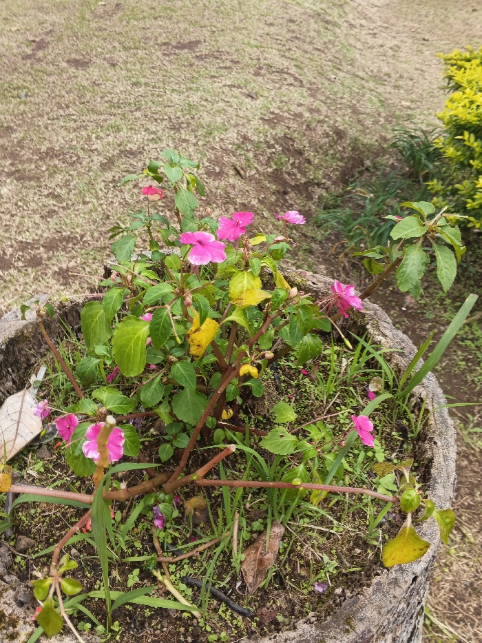 The scene, located in Lokossa, Benin, depicts a plant contained within a cylindrical, textured planter. The planter, composed of a gray-brown material suggestive of weathered concrete or a tree stump, is filled with dark earth. Centered within this container is a plant displaying multiple fuchsia-pink flowers, each with five petals. The foliage of the plant consists of both healthy green leaves and several exhibiting yellow discoloration. Brownish-red stems are visible. Incidental vegetation, including small green weeds and a single dried brown leaf, is present at the base of the primary plant. The ground immediately surrounding the planter is characterized by dry, sparse grass and exposed soil patches. A cluster of dense, vibrant yellow-green shrubbery is partially visible in the upper right background. No human subjects or discernible actions are observed.