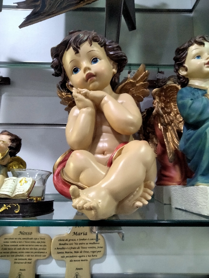 This image depicts a display of religious figurines within a retail setting, likely a souvenir or religious goods shop in Fátima, Portugal. The central subject is a light-skinned, cherub-like statue with dark brown, curly hair and prominent blue eyes, looking upwards and slightly to the left. Its hands are clasped together at chest level in a prayerful or contemplative gesture. The figure is seated with its legs crossed, partially covered by a drapery of red and gold fabric. Golden wings are attached to its back. This statue is positioned on a clear glass shelf, centrally in the foreground. To the immediate right of the central figure, partially obscured, is another similar statue, dressed in a blue garment, also with golden wings, facing in the same general direction. To the left, further in the background on the same glass shelf, is a smaller, light-skinned statue with brown hair, holding an open book with a cross symbol and standing next to a clear glass candle holder containing a white candle. Below the glass shelf, two light-colored, cross-shaped wooden plaques are visible. The left plaque features text titled "Nosso" (Portuguese for "Our"), containing the "Pai Nosso" (Our Father) prayer. The right plaque is titled "Maria," displaying text from the "Ave Maria" (Hail Mary) prayer. Both plaques conclude with "Amén." The background consists of light-colored walls or shelving, with hints of darker elements higher up, suggesting additional displays or fixtures. The overall scene indicates a commercial environment dedicated to selling religious artifacts.