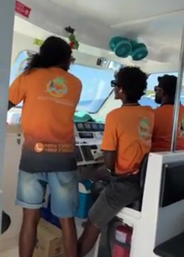 Inside the cabin of a small boat, three men wearing orange t-shirts are visible. The man in the front has long, dark, wavy hair and is wearing denim shorts and brown sandals. He stands near the boat's controls, gazing out of the front window. Another man sits in the driver's seat, while a third man is seated behind him. All three are wearing sunglasses. The boat's interior is white and includes a fire extinguisher and some storage. The windows offer a view of a bright, sunny sky and ocean.