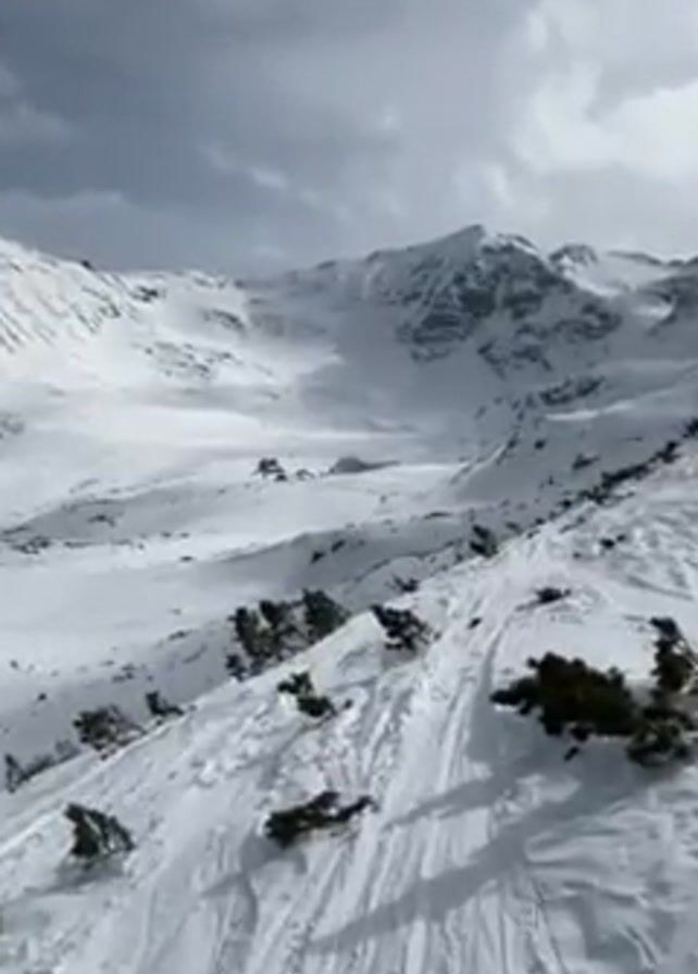 snowy mountain landscape with a few buildings in the distance. The sky is cloudy. The foreground is covered in snow with some small patches of vegetation. Ski tracks are visible in the snow. The camera pans slightly to the left, providing a wider view of the mountainous area and the buildings nestled within the snow-covered valley.