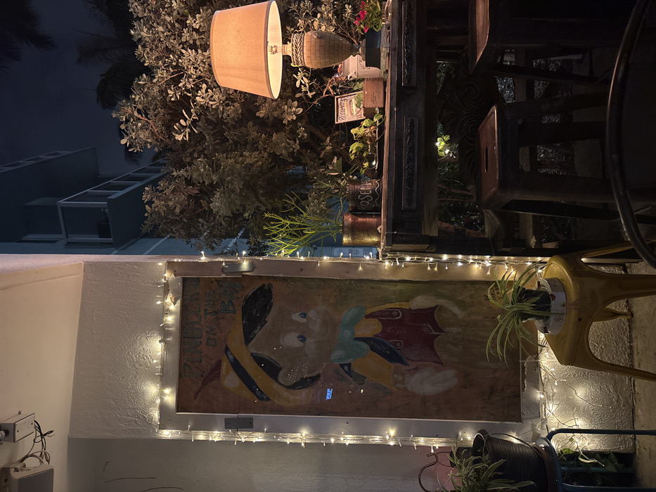 The image portrays an outdoor patio area in Miami, United States of America, observed at night. The scene is illuminated by artificial light sources, with a dark night sky visible above urban foliage and a light-colored building. On the left, a light-colored stucco wall features a large, vertical wooden panel or door. This panel displays a painted rendition of the character Pinocchio, depicted with a yellow and black pointed hat, yellow shirt, red overalls, and a light blue bow tie. The text "PINOCCHIO ON THE BAY" is painted in red letters above the character's head. Strands of small, warm white LED string lights frame this panel and extend vertically down the adjacent wall. At the base of the Pinocchio panel, a small potted spider plant rests on a bright yellow metal stool. A black potted plant is partially visible on a blue stool further to the left. On the right, a dark wooden table with carved decorative elements serves as a display surface. A prominent table lamp with a warm-toned, opaque fabric shade and a textured, decorative base is illuminated, casting a warm glow. Several potted plants are arranged on the table, including one in a copper-colored metal can labeled "ROSEMARY" and another in a lighter-toned metal can, also labeled "ROSEMARY." Below the table, two dark, industrial-style metal bar stools with square seats are positioned, indicating a seating area. A third, darker stool is partially visible in the bottom right corner. Dense green and reddish-brown vegetation, including trees and shrubs, forms a natural backdrop behind the table and lamp. A multi-story, light-colored building with dark-railed balconies is visible in the upper background against the dark sky, consistent with urban residential architecture. No individuals are present or engaged in any actions within the frame.
