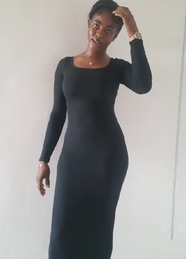 A young woman stands against a white wall, dressed in a long-sleeved, ankle-length black dress. She has her right hand raised, touching the top of her head, appearing to adjust her braided hair. She is wearing a watch and a necklace. There is background noise.