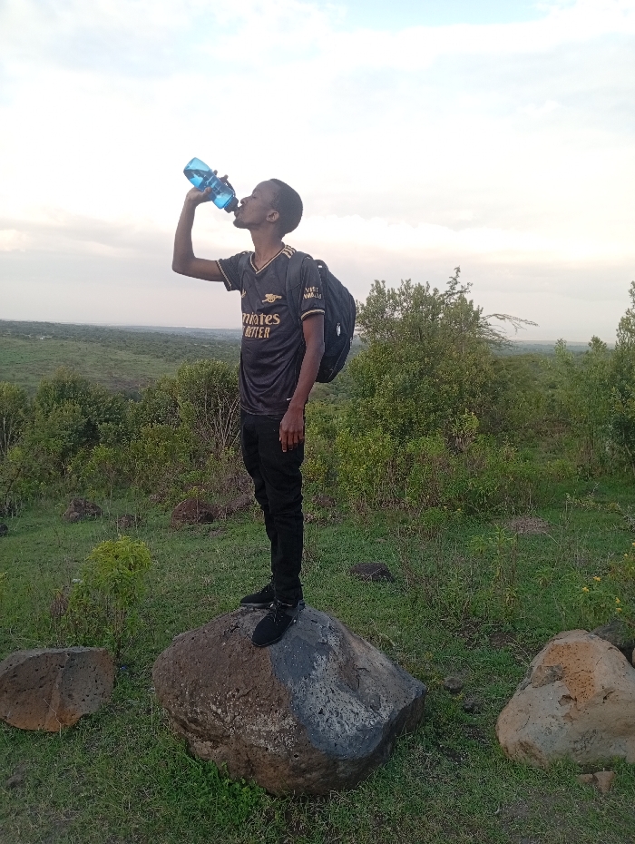 - "A young man stands atop a large rock in a grassy field, drinking from a blue water bottle" by FM-x0Sne2, licensed under CC BY 4.0