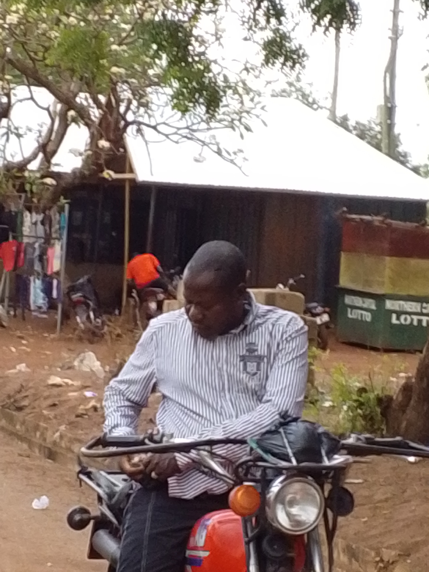 The image depicts a man sitting on a red motorcycle. He wears a striped shirt and dark pants. In the background, a building with a white roof and a green bin marked "NORTHERN CITY LOTTO" is visible. To the left, clothes are hanging on a line. The scene is likely in a residential area, possibly within Tamale, Ghana, based on the text on the bin.