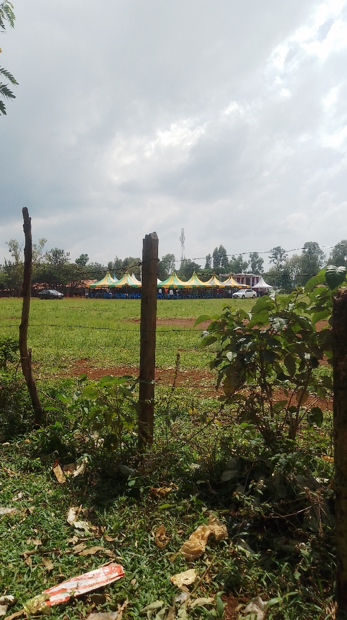 The scene depicts an outdoor gathering in a grassy field within Siaya Township ward, Kenya. The foreground features unkempt ground covered with green grass, patches of reddish-brown soil, and scattered litter including crumpled paper and plastic. A makeshift fence composed of three weathered, dark wooden posts and barbed wire strands partially obstructs the view. Low-lying green foliage and bushes grow immediately behind the fence line. In the midground, an expansive green field with visible dirt paths hosts a series of structures. A line of at least six conical tents, predominantly striped in yellow/gold and green, are erected across the field. A single white tent is positioned further to the right. Underneath the striped tents, rows of blue plastic chairs are arranged, occupied by numerous individuals attending the event. Two vehicles are present: a dark-colored sedan parked to the left of the tent line and a white sedan parked further right, near the white tent. The background consists of a dense line of trees with green foliage. A cellular tower with multiple tiers rises above the tree line towards the center-right. Faint outlines of structures with reddish roofs are visible through the trees on the far left. The sky overhead is largely overcast, dominated by diffuse white and light gray clouds.