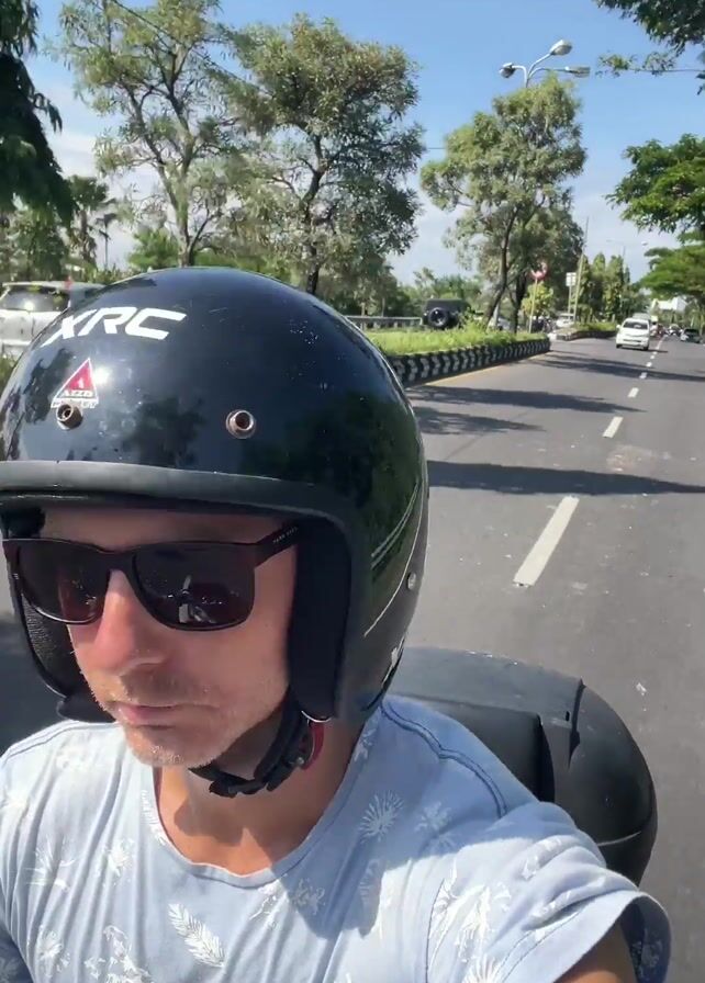 A man is riding a scooter on a paved road. He is wearing a black helmet, sunglasses, and a light blue t-shirt. He looks into the camera and smiles. There is a storage box on the back of the scooter. The road has white lane markings. Trees line the side of the road. There are other cars on the road. It is a sunny day.
