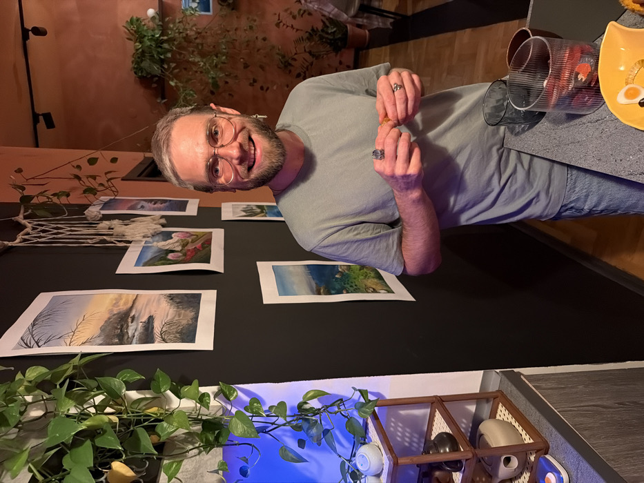 An indoor scene in Boreti, Montenegro, features a smiling male subject standing behind a dark grey countertop, facing the viewer. The man, with short brown-blonde hair, a beard, and round-framed glasses, wears a light sage green t-shirt and blue jeans. He has rings on both hands and an earring in his left ear. His hands are positioned in front of him, holding and manipulating a small orange item, possibly a piece of fruit. To the man's left, a dark wall displays five unframed landscape artworks or prints of varying sizes. A green vining plant hangs from above, partially obscuring the leftmost art and a three-tiered wooden shelf unit below it, which holds light-colored ceramic items. A blue light illuminates this area. The dark grey countertop on the left appears to be part of a kitchen area. To the man's right, a similar dark grey countertop extends into the foreground. On this surface, two ribbed glass tumblers (one dark, one clear containing red items) and a yellow bowl with olives and other food items are visible. The background reveals an area with warm, reddish-brown walls, additional plants, and a wooden floor, indicating a connected room or hallway. A black track light fixture is mounted on the ceiling in the background.