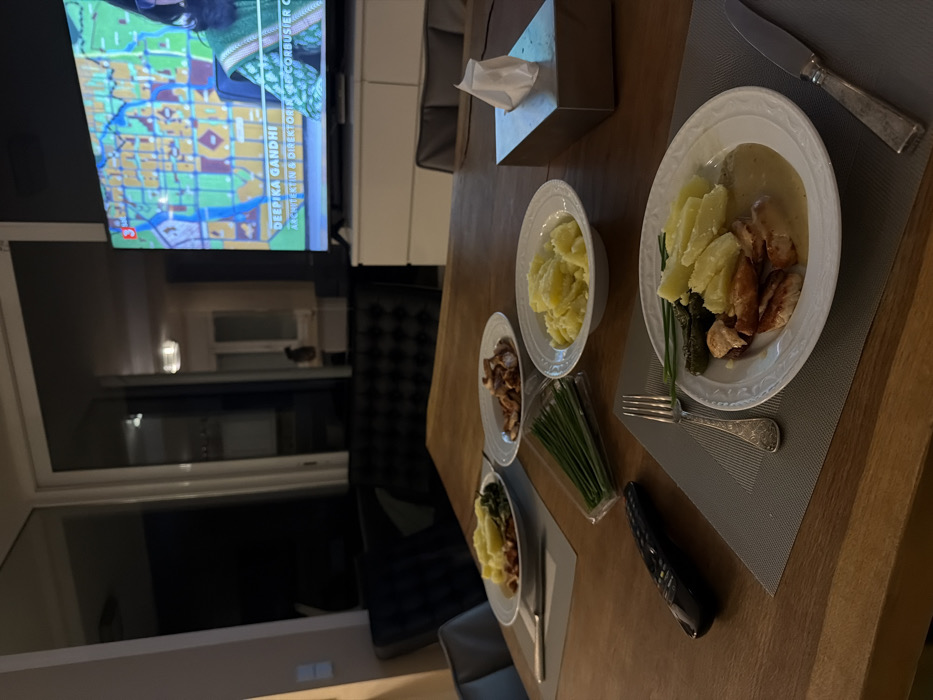 This image depicts an indoor dining scene during the evening or night in Santa Eulària des Riu, Spain. A large, rectangular wooden dining table occupies the foreground and midground, set with multiple individual meals. In the immediate foreground, a plate on a grey placemat contains slices of what appears to be cooked chicken, boiled or steamed potatoes, several gherkins, and a light-colored gravy. An ornate silver-colored fork is placed to the left of this plate, and a matching knife is to its right. A black television remote control rests to the left of the placemat. Further back on the table, a plastic-wrapped bundle of fresh chives is positioned. To its right, a white bowl holds a serving of boiled or mashed potatoes. Beyond this, another plate contains what appears to be sautéed mushrooms or pieces of meat. A third plate, partially obscured on the left, holds potatoes and dark green vegetables, possibly spinach, alongside other elements. A white rectangular tissue box with a single white tissue protruding from its top is located on the right side of the table. The background features a large flat-screen television mounted above a white, multi-drawer media console. The television displays a news program or documentary, showing a stylized map or urban plan on the left side of the screen and a partially visible person on the right. Text overlays identify "DEEPIKA GANDHI" as "ARCHITEKTIN & DIREKTORIN" for "LE CORBUSIER C". To the left of the television, a large glass door or window reflects the interior room, including a faint silhouette of a person standing in what appears to be an adjacent room or hallway. Dark, button-tufted upholstered seating is visible beneath the window/glass door, extending towards the left side of the frame. The overall lighting is internal and artificial, indicating a night-time setting.