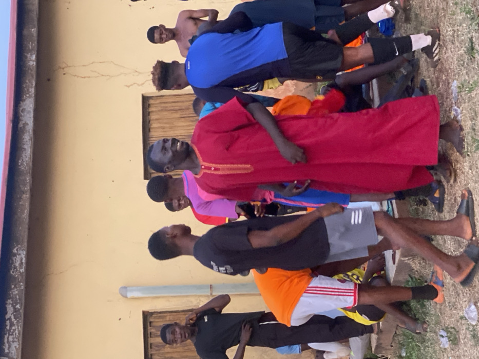 A group of young men stand outside a building. One man wears a long, red robe with embroidered detail around the neckline. Others wear casual clothing: t-shirts, shorts, and athletic gear. Some are barefoot, while others wear sandals or sneakers. They appear to be in conversation or listening to the man in the robe, who is smiling. The background is a simple, light-colored building and a patch of grass.