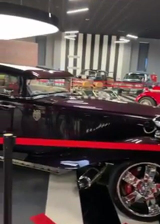 black vintage car on display in a museum. The car is behind a red rope barrier and is parked on a black-and-white striped floor with red stripes. Other cars are visible in the background. The museum has black-and-white striped walls and a black ceiling with round lights. The sound of the car engine revving can be heard.