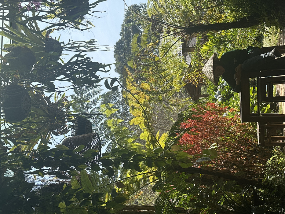 Lush greenery fills the scene, with ferns and various plants creating a dense, verdant landscape. Hanging planters dangle from above, showcasing delicate orchids. A person wearing a conical hat rests on a wooden structure amidst the foliage. Hydrangeas add splashes of blue, complementing the reddish-hued bushes below, all bathed in sunlight.