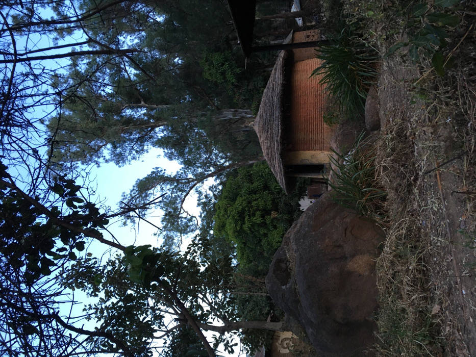 A small, round hut with a thatched roof stands amidst lush greenery and large boulders