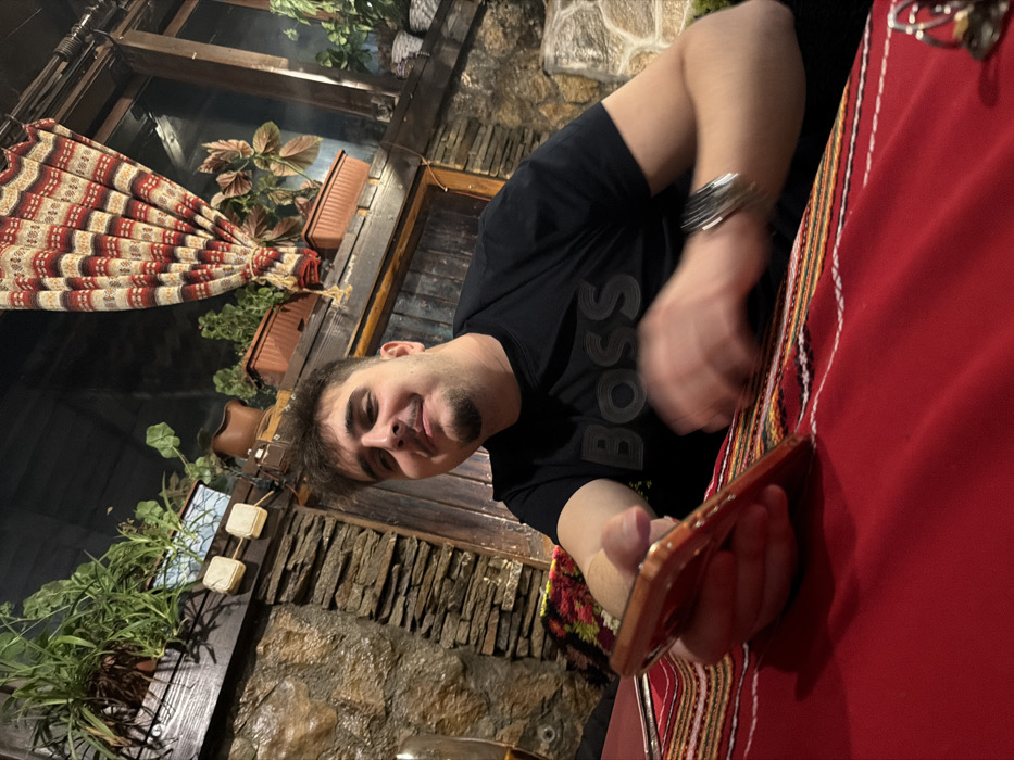 A young adult male, appearing to be in his mid-20s to early 30s, is seated at a table inside an establishment characterized by traditional Bulgarian decor