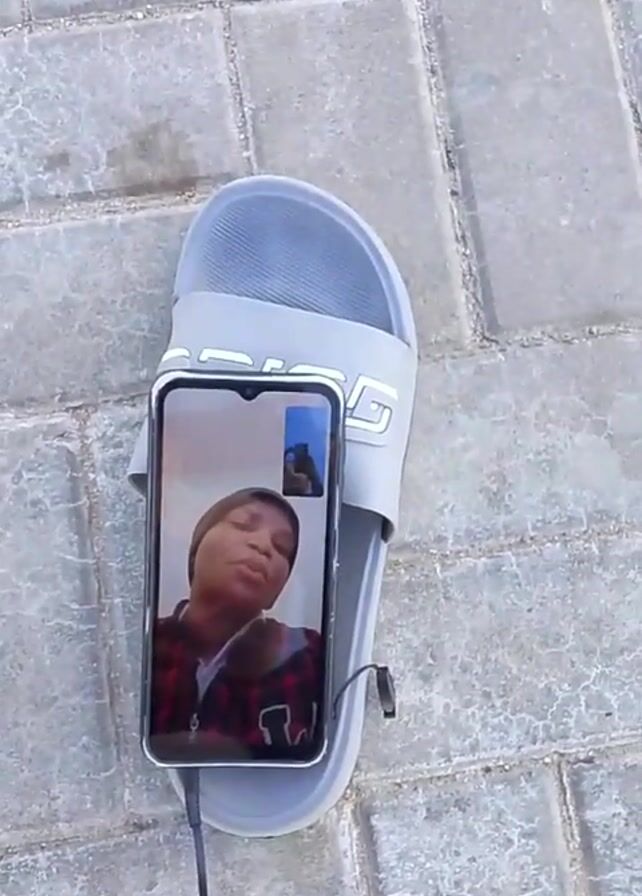 A smartphone rests atop a light gray slide sandal on a paved surface of light gray bricks. The smartphone screen displays a video call with a person wearing a red plaid shirt and a head covering. This person is drinking from a pink cup. The person on the other end of the call is visible in a small window at the top right of the smartphone screen. A dark cable is attached to the bottom of the smartphone.