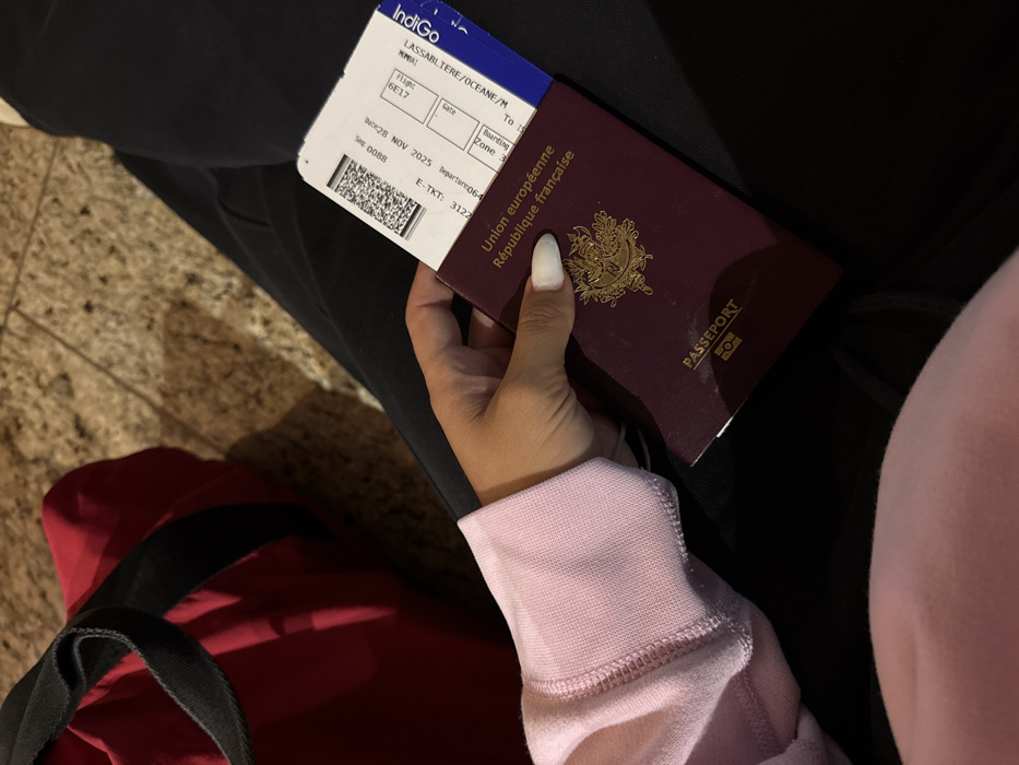 A hand holds a French passport and an IndiGo boarding pass