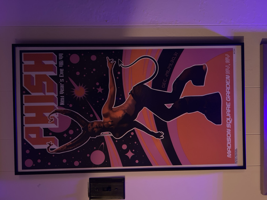 A vertically oriented Phish New Year's Eve 98/99 concert poster is centrally depicted, mounted on a light-colored wall within an interior room