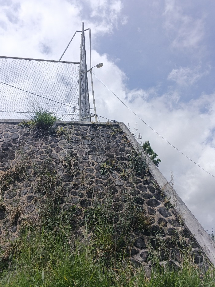 The image displays an outdoor scene in ឃុំ ផាត់សណ្ដាយ, Cambodia, viewed from a low perspective looking upwards. The foreground is dominated by green grass and various weeds. Directly behind this vegetation, a retaining wall constructed of dark, irregularly shaped stones mortared together rises diagonally across the frame. Numerous weeds and small plants are observed growing from the crevices within the stone wall and along its surface. A concrete coping caps the top of the stone wall. Above this, a metal chain-link fence is visible, featuring an extended netting section at its top. A vertical metal pole, supporting parts of the fence structure, has a horizontally oriented street light fixture attached to it. Multiple dark wires stretch across the upper midground. The background consists of a partially cloudy sky, showing segments of blue sky interspersed with white clouds.