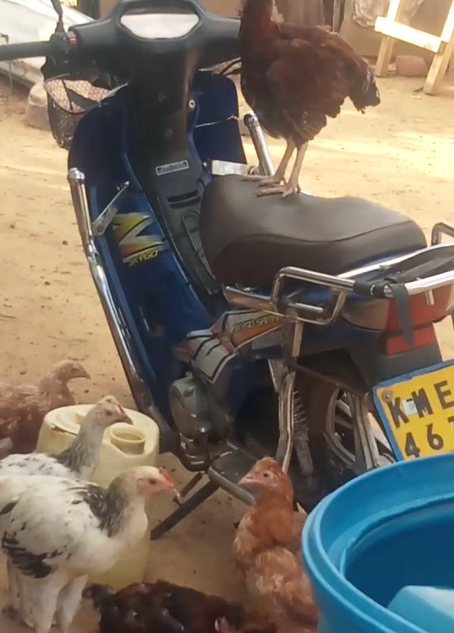 blue scooter parked on what appears to be a dirt ground. Several chickens of various colors are milling around the scooter, some near a yellow plastic jug and a blue bucket. One brown chicken is perched on the scooter itself. The scooter has a license plate visible, displaying the characters "KME 46". The setting suggests an outdoor, perhaps rural environment.