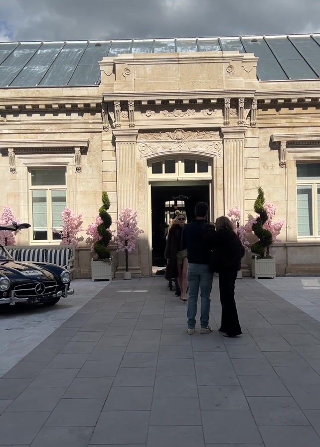 Here is a brief description of the video: The video shows the exterior of a grand building with a glass-paneled roof and ornate stone facade. The building's entrance is flanked by potted pink trees and twisted shrubs. A black and white striped vintage car is parked to the left. In the foreground, two people stand on a tiled terrace. Emerging from the building's entrance, a woman in a fur coat and shorts walks with a man in a suit. Another woman is also seen leaving the building. The sky above is cloudy.