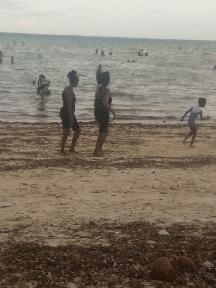 The image displays a beach scene in Shanzu ward, Kenya. The foreground consists of light brown sand extensively covered with dark brown organic material, identified as seaweed. In the lower right, two brown, roughly spherical objects consistent with coconuts are present. Three individuals are prominent in the midground, near the water's edge. From left to right: 1. An adult female, seen in profile, walking towards the right. She wears a dark, one-piece garment, likely a swimsuit or athletic wear, and has dark hair styled in a bun. 2. An adult female, also in profile, walking towards the right. She wears a similar dark, one-piece garment and has dark hair. 3. A child, in profile, running towards the left. The child wears a light-colored, possibly white and blue, one-piece swimsuit. The background features a body of water with a choppy, light grey surface. Numerous indistinct human figures are observed wading or swimming further offshore. One individual in the mid-left background is seen with a dark, circular flotation device. The sky is overcast and light grey, merging indistinctly with the distant water.