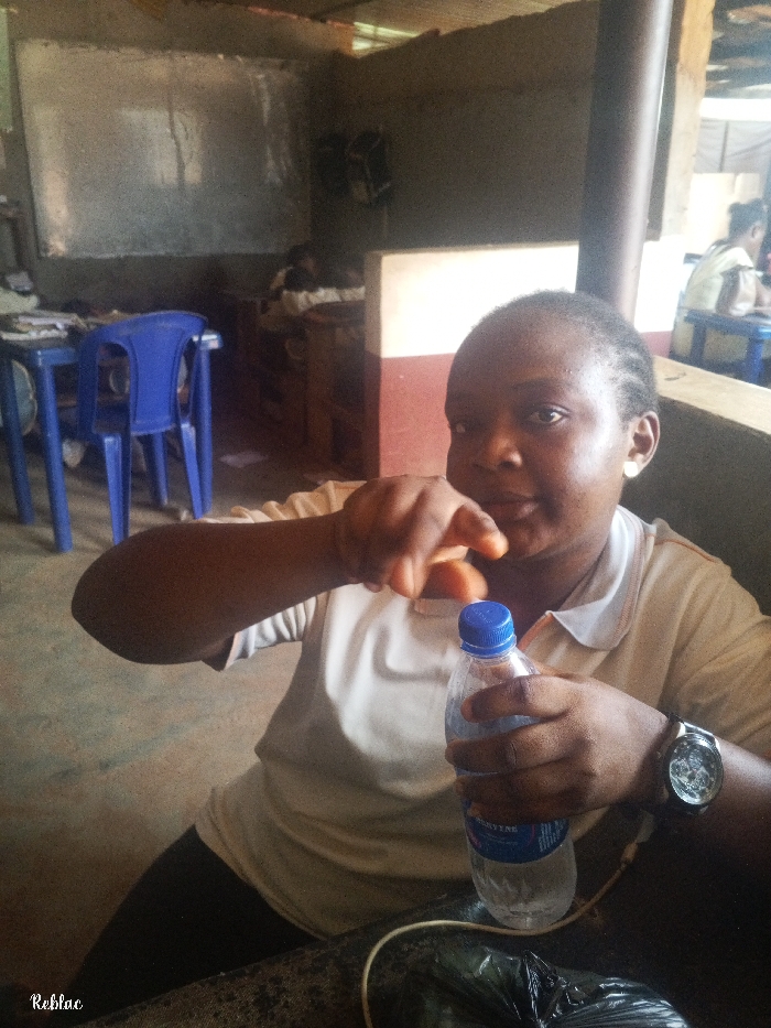 A dark-skinned individual, appearing female, with short dark hair, is seated indoors, looking directly at the camera. The individual wears a light-colored collared polo shirt, dark pants, and a dark-faced wristwatch on the left wrist. In the right hand, a clear plastic bottle of Rytne brand water with a blue cap is held; the left hand is raised with fingers curled above the bottle. On the dark surface in the immediate foreground are a white cable and a crumpled black plastic bag. The background shows an interior room with light-colored walls featuring a lower reddish-brown stripe. A large, rectangular, light-colored board is mounted on the left wall. A blue plastic chair is positioned next to a light-colored table with documents on it in the mid-left background. Another individual is partially visible in the far-right background, seated at a table with a blue chair, facing away from the camera. The location is an interior space in Unknown, Unknown.