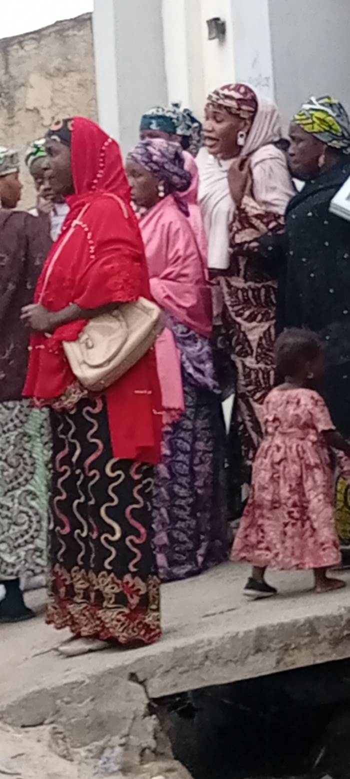 A group of women in colorful, patterned traditional clothing stand near a young child. The women wear head coverings and long skirts. The woman in the foreground is dressed in red with a beige purse. The child is wearing a pink dress and black shoes. They are standing on a concrete ledge. The background is out of focus.