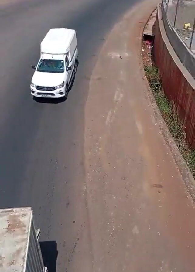 road with two vehicles. A white truck-like vehicle with a covered back is travelling along the left lane. A large truck carrying a shipping container is also travelling on the same lane towards the viewer. The video is taken from a high vantage point. The roadside has concrete and metal barriers. Buildings and vegetation are also visible. A brief conversation can be heard in the video, but is difficult to understand.