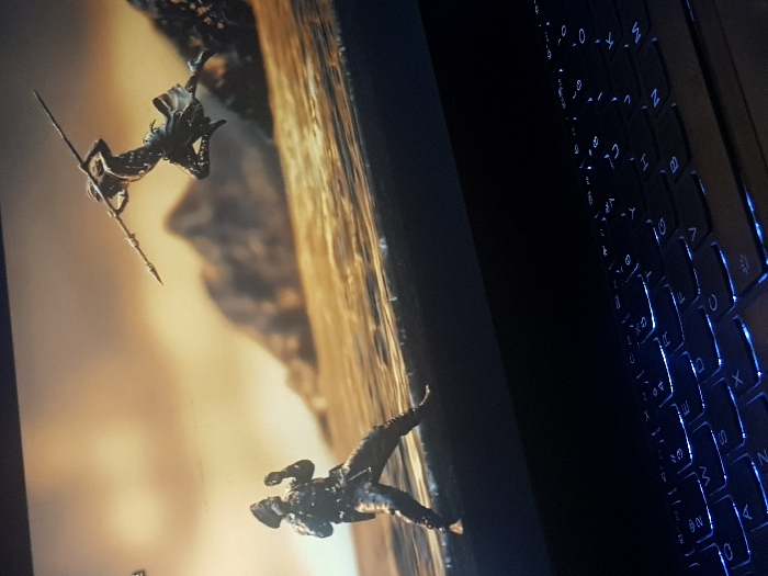 This image captures a laptop screen displaying a digital scene, with the laptop's backlit keyboard visible in the foreground, within Samaru, Nigeria. The screen content depicts two stylized male figures engaged in combat on a rocky or watery landscape under an orange-hued sky with blurred mountains in the background. On the left, a figure resembling a soldier in a cap and uniform stands defensively with raised hands. On the right, a more lightly clad figure is captured mid-air, leaping forward while holding a spear pointed towards the left figure. The lower portion of the image features the black QWERTY keyboard of the laptop, illuminated by a blueish-white backlight.