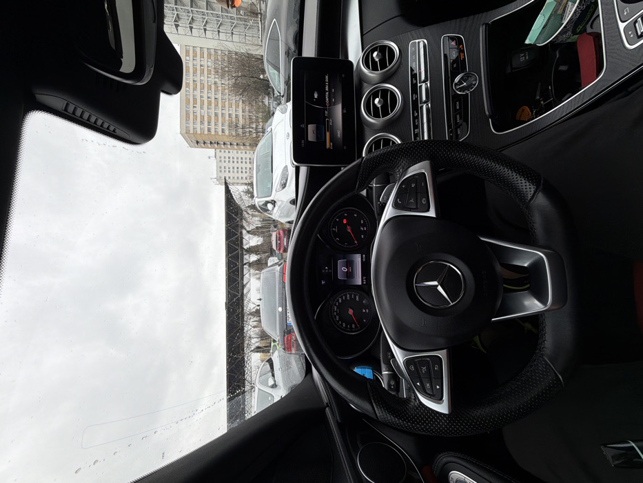 The image presents a first-person view from the driver's seat of a stationary Mercedes-Benz vehicle, identified by its steering wheel emblem and dashboard