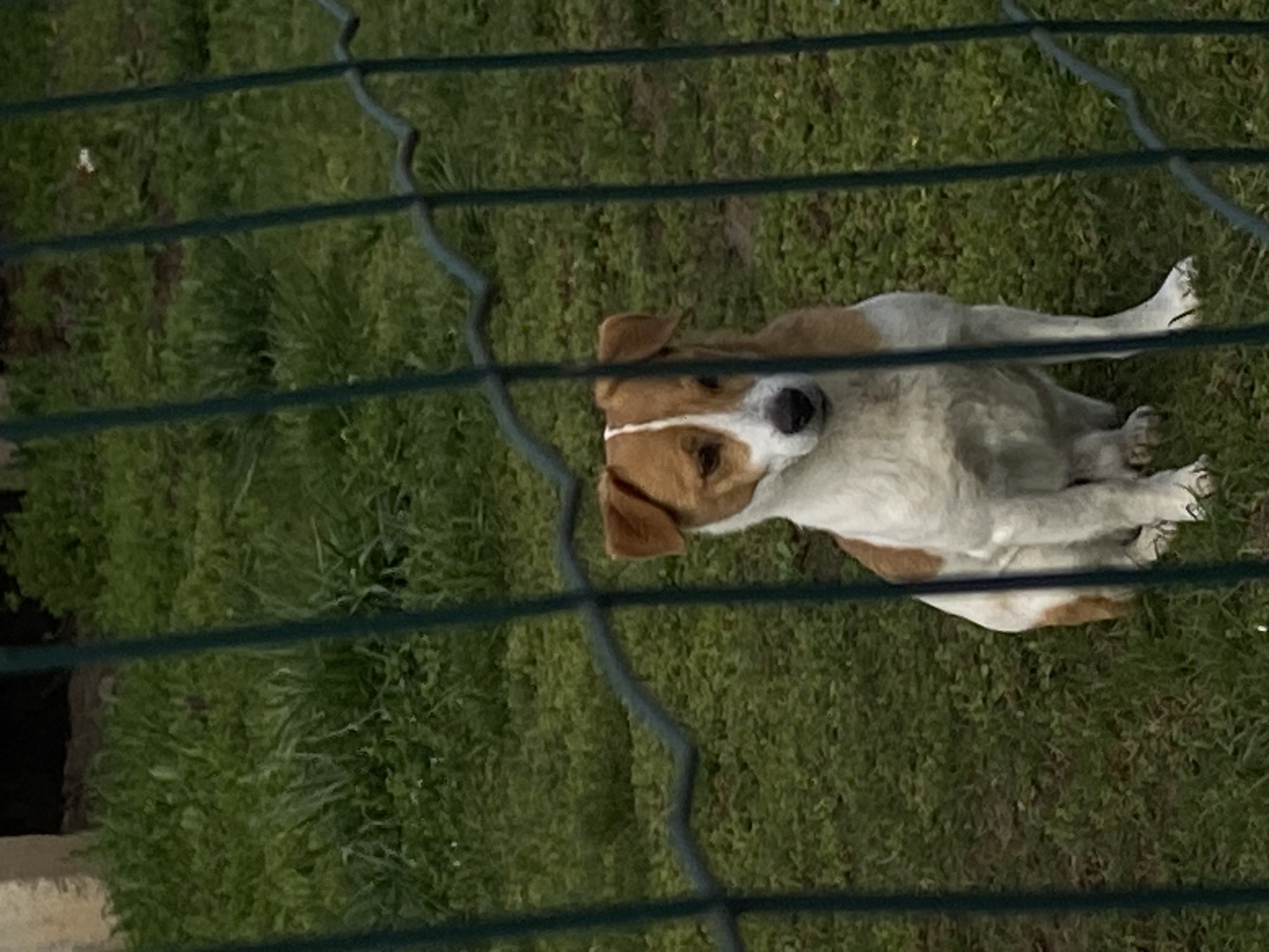 medium-sized dog lying on green grass, viewed through a green wire fence. The dog is predominantly white with brown markings on its head, ears, and hindquarters. The grass appears to be a lawn or field. The precise location is not discernable as Dobri dial, Bulgaria.
