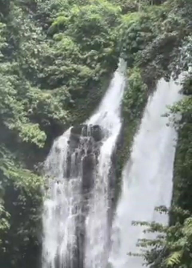 lush, green waterfall scene. The waterfall has two main streams cascading down a rocky cliff face, surrounded by dense tropical foliage. At the top of the frame, there are some buildings or structures visible amongst the trees. The overall view is a high angle shot capturing the full waterfall and its surroundings.
