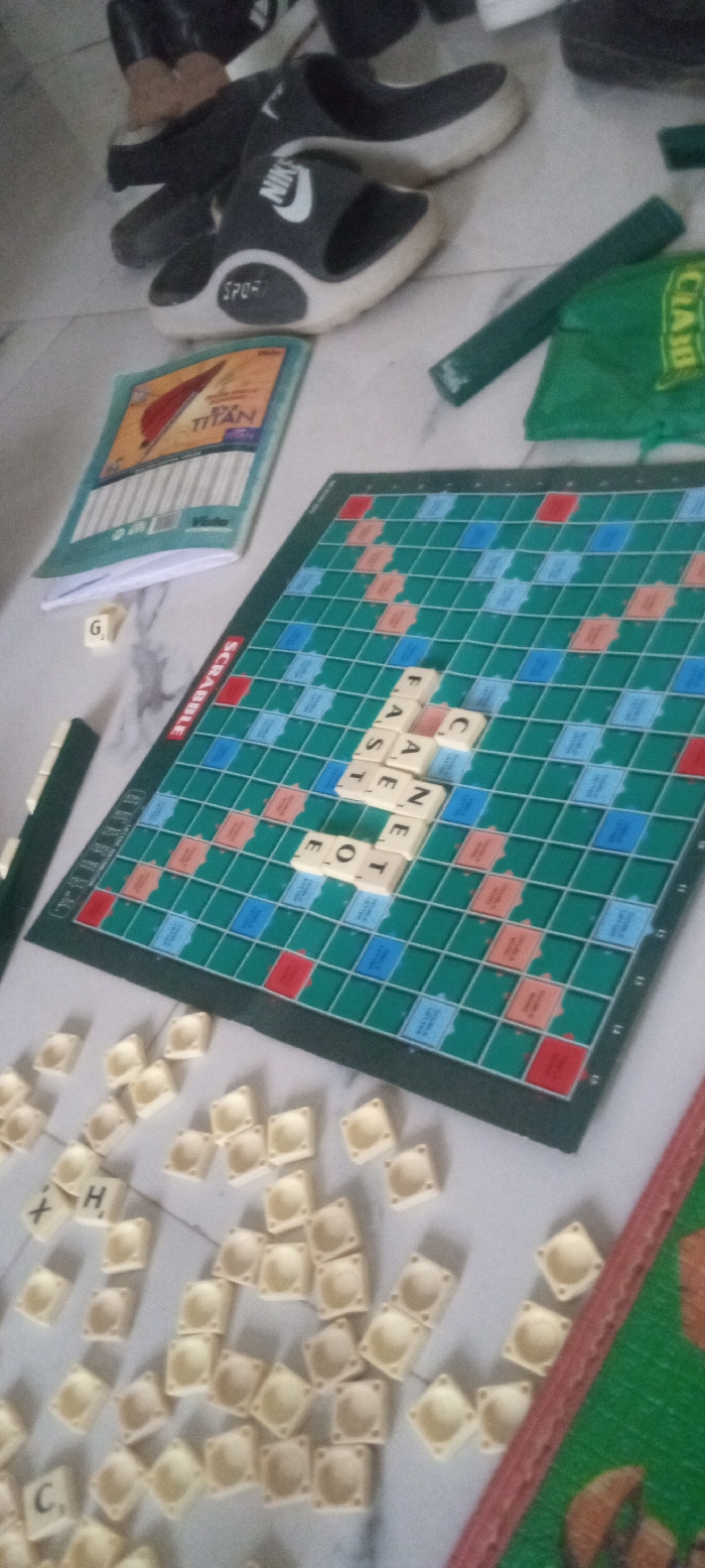 A Scrabble board game is laid out with the word "FASTONE" spelled out. A pile of letter tiles scatters near the board. To the side sits a notebook labeled "TITAN," alongside what appears to be a Scrabble tile rack and bag. In the background, a collection of shoes is visible.