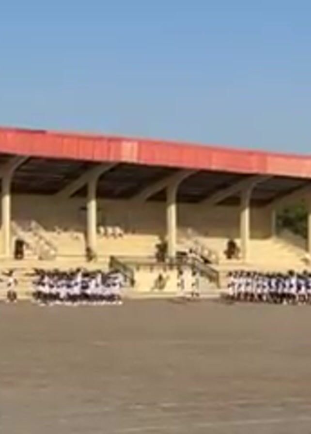 A wide shot shows a crowd of people in uniforms standing on a large dirt field, facing a small stadium with a red roof. The people appear to be in formation and are moving their arms. The sky is blue and the lighting is bright, suggesting a sunny day. Trees line the periphery of the field. The atmosphere seems celebratory or ceremonial. A bird flies across the field in front of the camera.