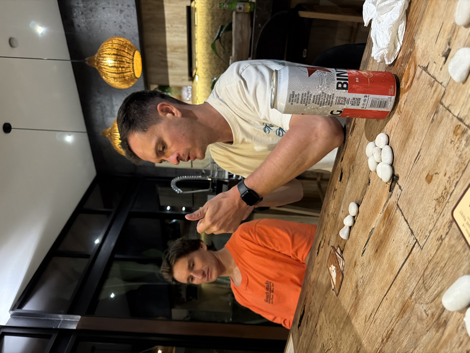 This image depicts an indoor scene in Mas, Indonesia, featuring two light-skinned males seated at a distressed wooden table. The male on the right, appearing mid-30s to early 40s, wears a light-colored t-shirt and a dark smartwatch on his left wrist. He is actively speaking, with his mouth slightly open and hands raised, gesturing with his left thumb prominently visible. To his immediate right on the table is an upright 500ml Bintang beer can and a crumpled white paper napkin. To his left, a cluster of approximately ten smooth, white, irregular stones is present. The male on the left, appearing 20s to early 30s, wears a loose orange t-shirt with "Slouch studio" text and is observed listening, with a neutral expression, looking slightly downwards. Near him on the table are two rectangular game cards, one partially visible with an animal illustration, and a smaller cluster of three white stones. The background features dark-framed glass panels, dark textured walls, a kitchen-style faucet, and two illuminated golden, ribbed pendant lamps suspended from a white ceiling with recessed lighting.