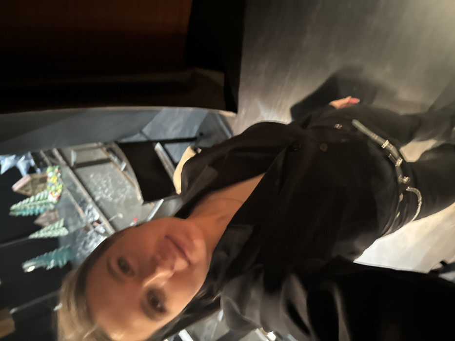 A female subject is depicted taking a selfie within what appears to be a backstage or side-stage area of a performance venue in Unknown, Russia. The individual, positioned in the foreground and facing the camera directly, has long, dark hair. She is wearing a black collared button-up top, dark trousers, and a black belt adorned with multiple silver-colored buckles and a decorative silver chain. Her right arm is extended, holding the camera. In the blurred background, a stage set is visible, featuring several stylized miniature trees, some appearing green and others light blue/white, along with a small, brown, house-like structure. These props are arranged on a dark, reflective surface. To the immediate right of the subject, a dark stage curtain is present, extending vertically along the frame. A dark chair with a light-colored seat cushion is partially visible in the mid-ground, positioned between the subject and the stage props. The flooring in the immediate vicinity of the subject is dark and reflective. The lighting suggests an indoor setting, possibly with ambient stage lighting or direct flash from the camera.