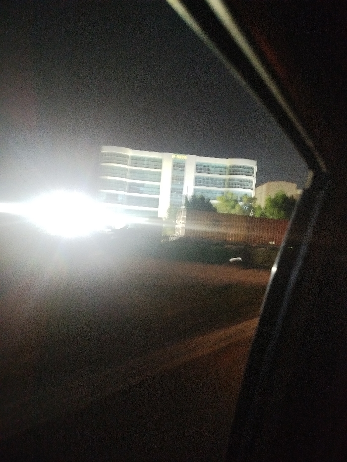 A nighttime view from inside a vehicle shows a lit building in the distance. The building appears to have multiple stories and a sign reading "FMN." A bright light source obscures some of the foreground. A long, dark object, possibly a container, sits in front of the building. Part of the vehicle's interior is visible on the right side of the frame, contributing to the perspective. The image is dark and grainy, obscuring details.