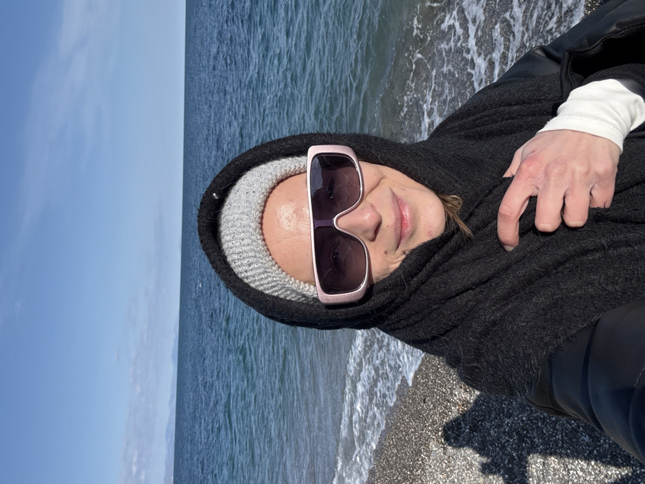 - "A selfie-style image depicts a woman standing on a pebbled beach in Alushta, Ukraine, with the Black Sea and distant landmasses in the background under a clear blue sky" by FM-IIZvf2, licensed under CC BY 4.0
