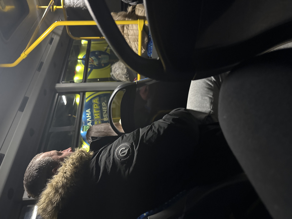 The image depicts the interior of a public transport vehicle, likely a bus, at night, with several passengers seated. In the immediate foreground, the legs and lap of an unseen individual, clothed in dark fabric, are partially visible. Directly in front, a male passenger is seated, viewed from his left side profile. He has short, greying hair and wears a black winter jacket with a brown fur-lined hood. A circular patch on his left sleeve displays the text "EXPLORER ONE" and an abstract symbol. He is looking towards the right side of the frame. In front of him, a female passenger with long dark hair is seated, viewed from behind. Further into the background, another passenger with grey, curly hair is visible from behind. Through the vehicle's windows, an illuminated outdoor advertisement is visible. The advertisement features blue text on a yellow background. Legible Bulgarian Cyrillic text includes "АЛНА", "В ИГРА", and "ВЕЧЕР.", which translates to "ALNA" (likely part of "National" or "Local"), "IN GAME" or "IN PLAY", and "EVENING". A stylized blue and white figure is also part of the advertisement. This sign is located in the city of Targovishte, Bulgaria. The interior of the vehicle is dimly lit, with yellow grab rails visible. Passengers appear to be passively traveling.